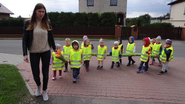 Przed kolejnym spacerem Pani Justynka powiedziała nam o najważniejszych zasadach bezpieczeństwa, które musimy przestrzegać wychodząc poza teren przedszkola. Ubrała nam kamizelki odblaskowe, żeby wszyscy dobrze nas widzieli. Byliśmy skupieni i niezwykle przejęci powagą sytuacji :)